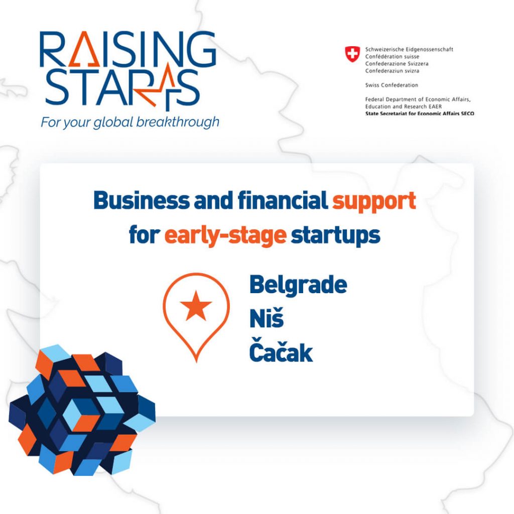 Raising Starts program is being implemented by Science Technology Park Belgrade, with the support of the Swiss Government and in partnership with Science Technology Park Niš and Science Technology Park Čačak. Program Raising Starts is created through the project “Technopark Serbia 2 –Boosting exports through technoparks” under the Memorandum of Cooperation between the Government of the Republic of Serbia (on behalf of the RS Government: Ministry of Education, Science, and Technological Development) and the Swiss Government (on behalf of the Swiss Government: State Secretariat for Economic Affairs, SECO).